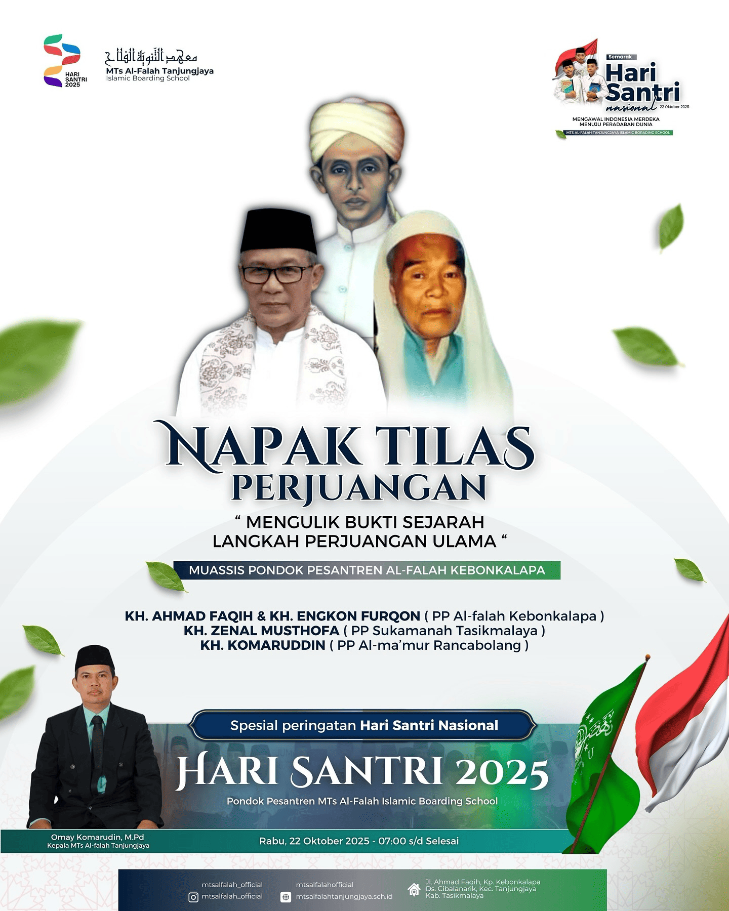 Dengan penuh rasa syukur, santri santriyah MTs Al-falah telah selesai melaksanakan salahsatu rangkaian acara semarak hari santri 2025, yakni *Ziyaroh muassis dan napak tilas perjuangan ulama* dengan berjalan kaki dari Ponpes Al-Falah Tanjungjaya, ke Ponpes Al-Ma’mur sukarame, dilanjut ke ponpes KH Musthofa Sukamanah.